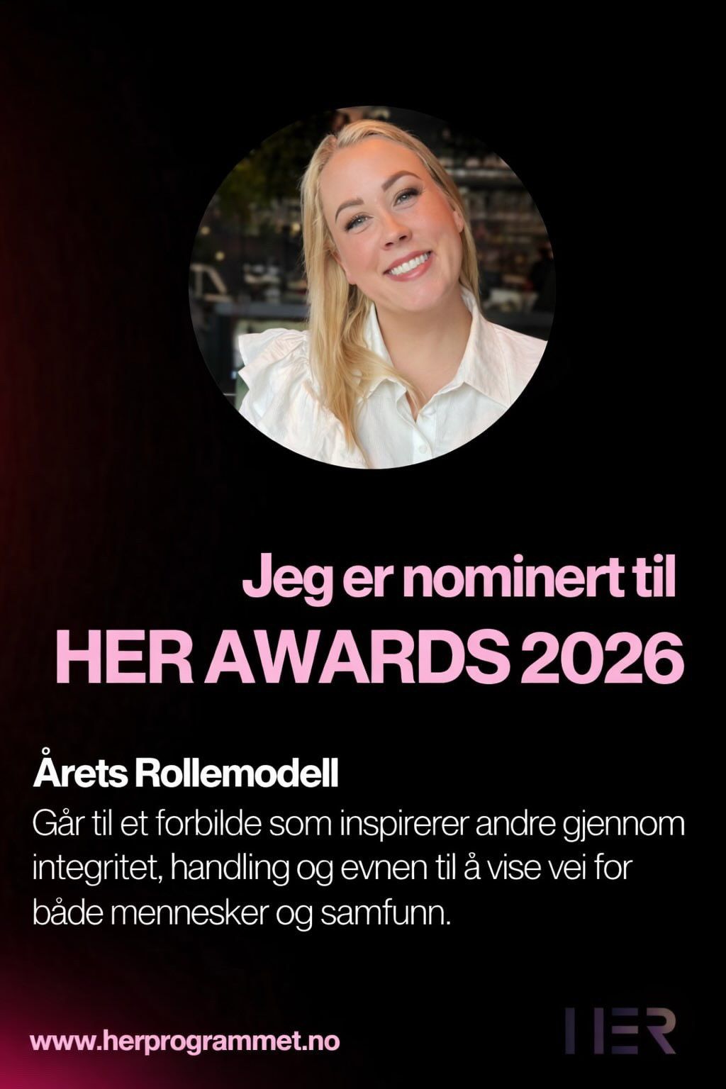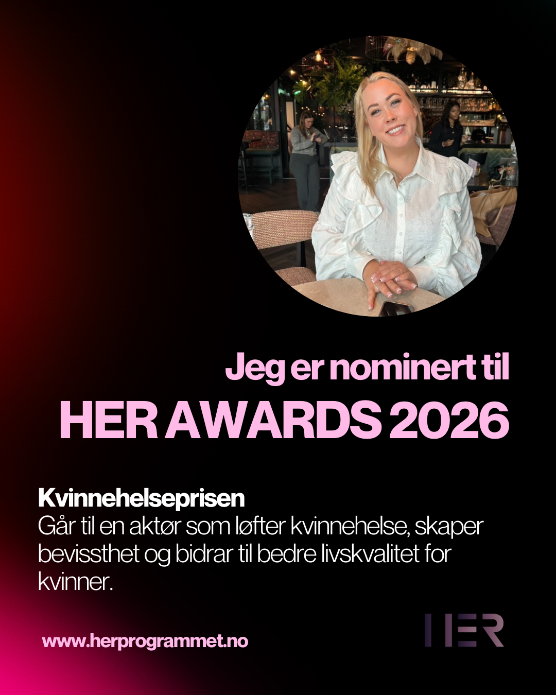 I 2026 er jeg nominert til HER Awards i kategorien Kvinnehelseprisen og Årets Rollemodell.